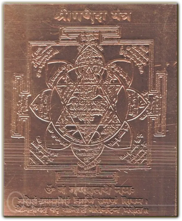 Ist das Leben komplziert, uneffektiv und Probleme scheinbar unlösbar, könnte das Ganesha-Yantra helfen, Hindernisse aus dem Weg zu räumen. Astrologische Bedeutung und Zuordnung: Jungfrau, Merkur https://de.wikipedia.org/wiki/Ganesha Ganesha (Sanskrit गणेश, Gaṇeśa [gʌˈɳeːɕʌ]) (gaṇa: ‚Gefolge‘, ‚Schar‘, īś: ‚Gebieter‘, also „Herr der Scharen"[1]) ist eine der beliebtesten Formen des Göttlichen im Hinduismus. Weitere verbreitete Namen sind unter anderem Ganapati (‚Gebieter der Scharen‘), Vinayaka (‚Entferner [der Hindernisse]‘), Vighnesha (‚Herr der Hindernisse‘), Vigneshvara ("Zerstörer der Hindernisse"), Vighnantaka, Varada ("der Wohltaten Schenkende"), Siddhita ("der, der Erfolg bei der Arbeit schenkt") ......Ganesha wird gefragt, wenn man Glück, Erfolg oder gutes Gelingen für den Weg oder am Anfang einer neuen Unternehmung braucht, beispielsweise für eine Reise, Hochzeit, Hausbau, Geschäftsprüfung, Klausur oder den Beginn eines neuen Tages, er steht für jeden Neuanfang und verkörpert Weisheit und Intelligenz. Zu seinen Angelegenheiten gehören die Poesie, Musik, Tanz, Schrift und Literatur, und er ist der Herr über die Wissenschaften und Gott des Handels. Die meisten Kaufleute betrachten ihn als ihren Schutzherrn und in fast jedem Laden ist eine Ganeshastatue zu finden. Für viele fromme Hindus ist das erste, was in ein neues Haus kommt, eine Statue des Ganesha. Diese segnet das Haus und verheißt Glück. Er ist auch auf fast jeder Hochzeitseinladungskarte zu finden. ...Rätselhaft erscheint Ganeshas Mischform aus Mensch und Elefant. ...Ganesha ist der Gott und "Herr der Hindernisse", sowohl der Beseitiger als auch der Setzer von Hindernissen, wenn sich jemand ihm gegenüber respektlos verhält oder diese für ihn notwendig sind. ...Für jene Gläubigen, die in Ganesha oder Ganapati das Höchste sehen, ist Ganesh Chaturthi (nach dem Mondkalender zwischen Mitte August und Mitte September) das höchste aller Feste im Jahreslauf; Ganesha Yantra aus Kupfer ca. 8 x 10 cm