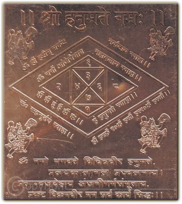 ...Dem Ramayana zufolge kann niemand Hanuman an Kraft, Sanftmut und Klugheit übertreffen. Er verkörpert den Idealtyp des Dieners und steht für Treue, Hingabe und Gehorsamkeit gegenüber dem Herrn....Sein wichtigster Feiertag ist Hanuman Jayanti, was als sein Geburtstag gilt und nach dem hinduistischen Mondkalender im März/April gefeiert wird. Hanuman Yantra aus Kupfer ca. 8 x 10 cm